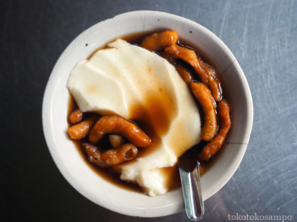 豆花に黒糖シロップや生姜シロップを掛けて、その上にタピオカやピーナッツ・小豆などをトッピングして食べるデザートです。