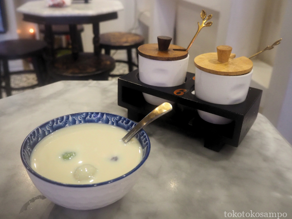豆乳に甘さがついていない分お団子が甘いので、お団子を少しずつ崩しながら食べたり、もっと甘い方が好みの方はテーブルに置かれている甘味料で味を調整しながら食べてみて下さい。
