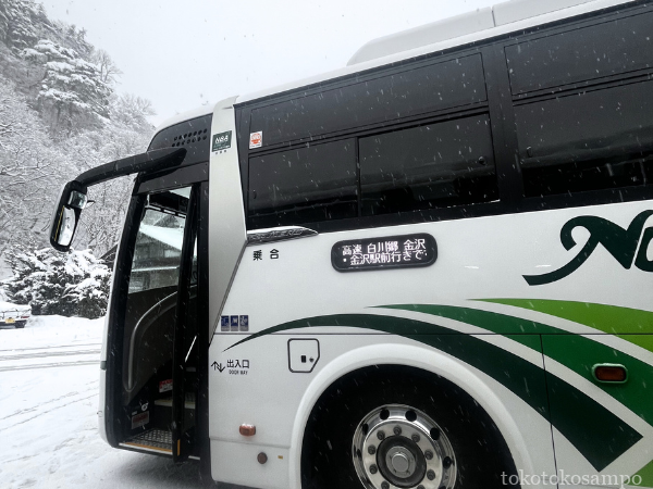 私は金沢駅付近で連泊予定だったので日帰りでしたが、白川郷に宿泊するためにキャリーケースを持って乗車されている方もちらほらいました。昼の雪景色も真っ白で綺麗だったけど、夜のライトアップされた様子も昼の顔とは違って幻想的なんだろうなぁ…。