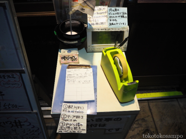 いきいき亭は、お店の前にある用紙に自分で食べたいメニューを記入して、入り口の扉に貼っていくスタイル。その用紙を確認しながら店員さんが順番に案内してくれます。