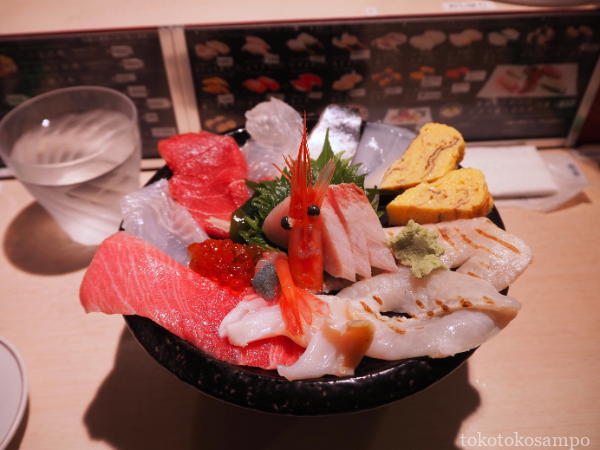 カウンター越しにお客さんとの会話を楽しみながらも素早く海鮮丼を仕上げていく職人技を眺めていると、あっという間に海鮮丼が到着しました。